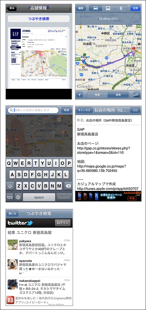 カジュアルマップでは、これらの全店舗情報をiPhoneアプリケーションに内蔵しているため、素早いマップ検索が可能です。
