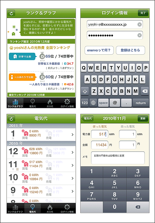 今回のenervo for iPhoneは、パソコンからだけでなく、携帯端末からも手軽にenervoをご利用いただけるように、電気代・ガス代の入力、ランキングの確認(全国ランキング/都道府県ランキング)、比較グラフ表示(昨年の自分と比較/全国平均と比較/都道府県平均と比較)など、enervoの主要な機能をコンパクトにまとめたiPhone/iPad対応アプリケーションです。