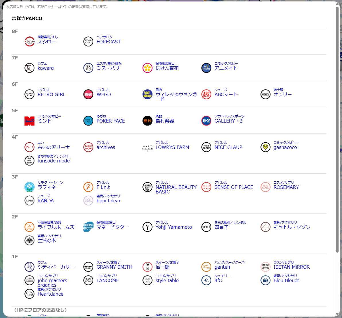 吉祥寺PARCOのテナント一覧を表示したところ