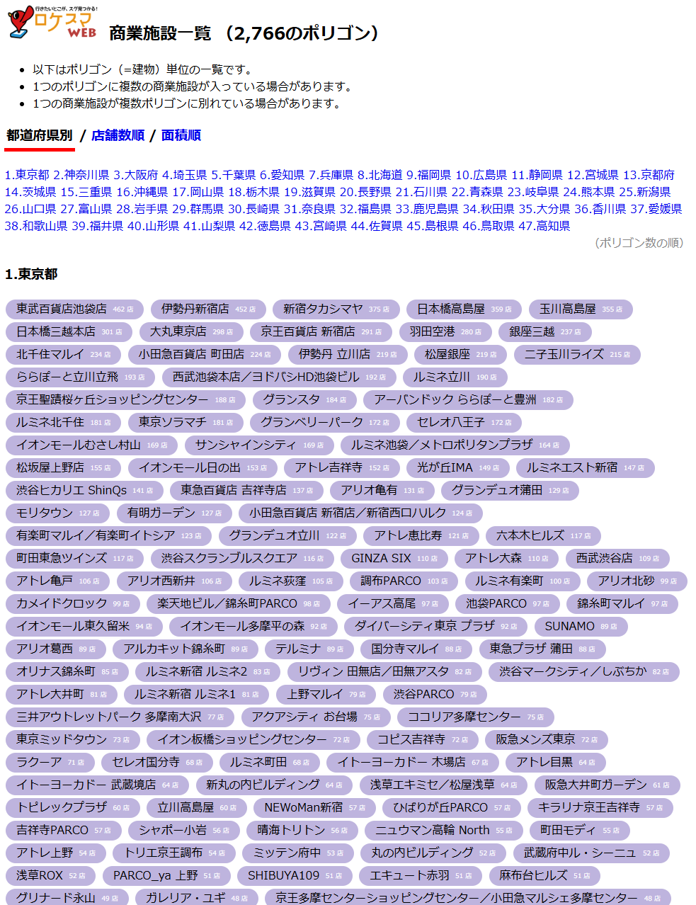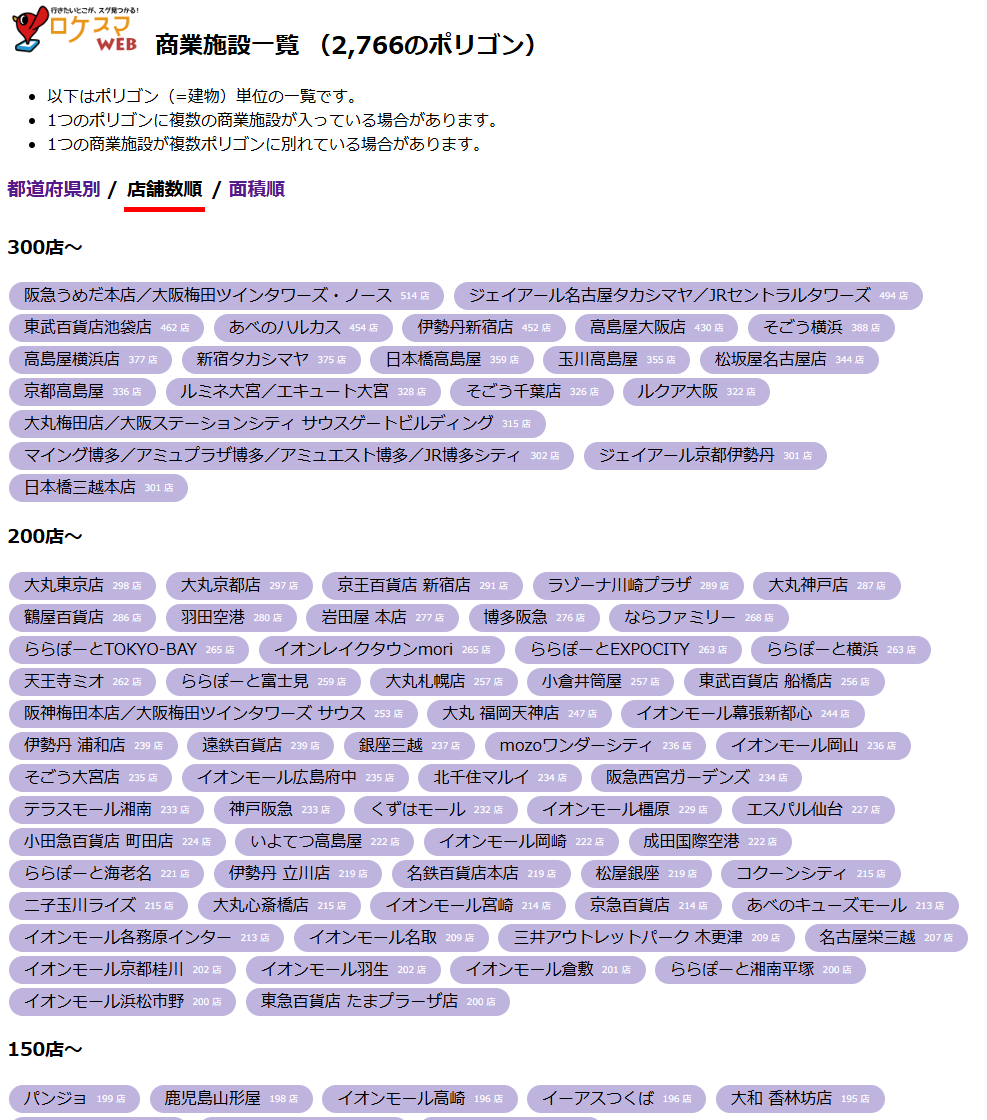 全国の商業施設を表示(店舗数順)