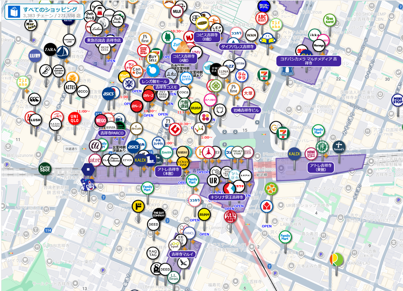 吉祥寺駅周辺の商業施設を表示したところ