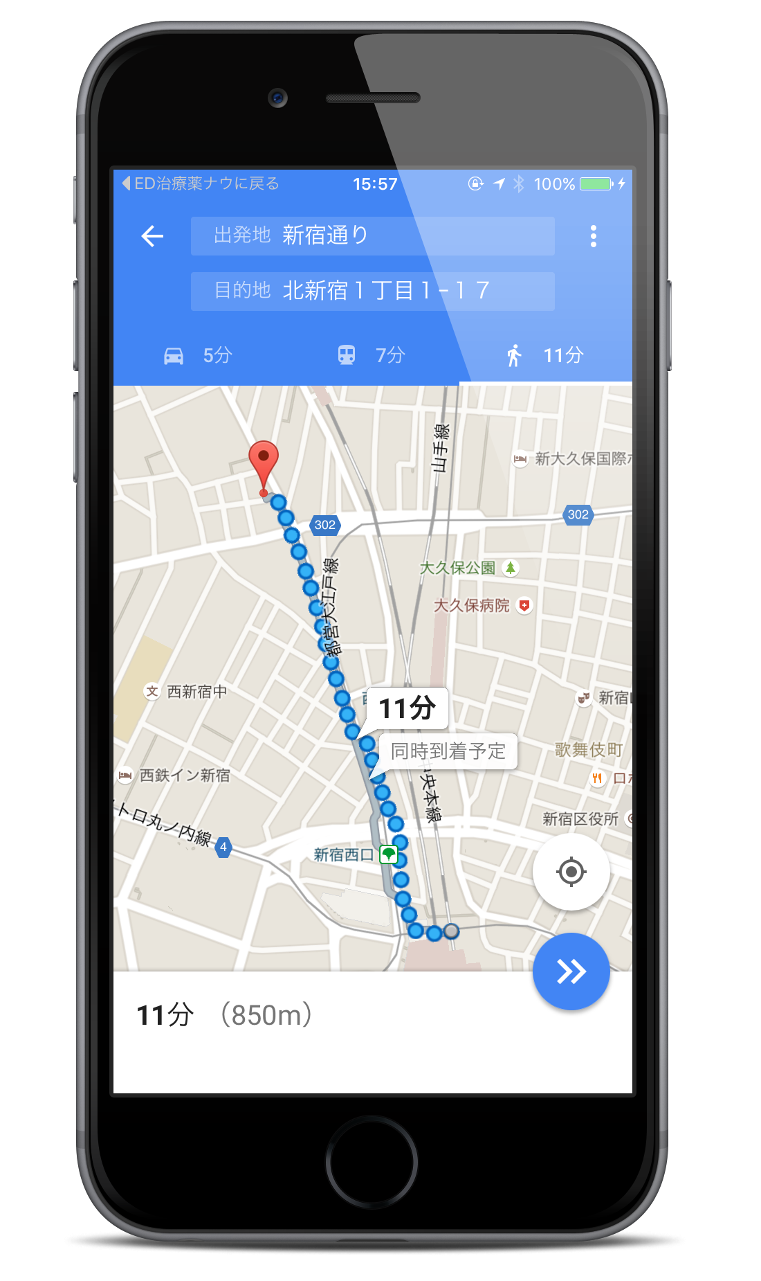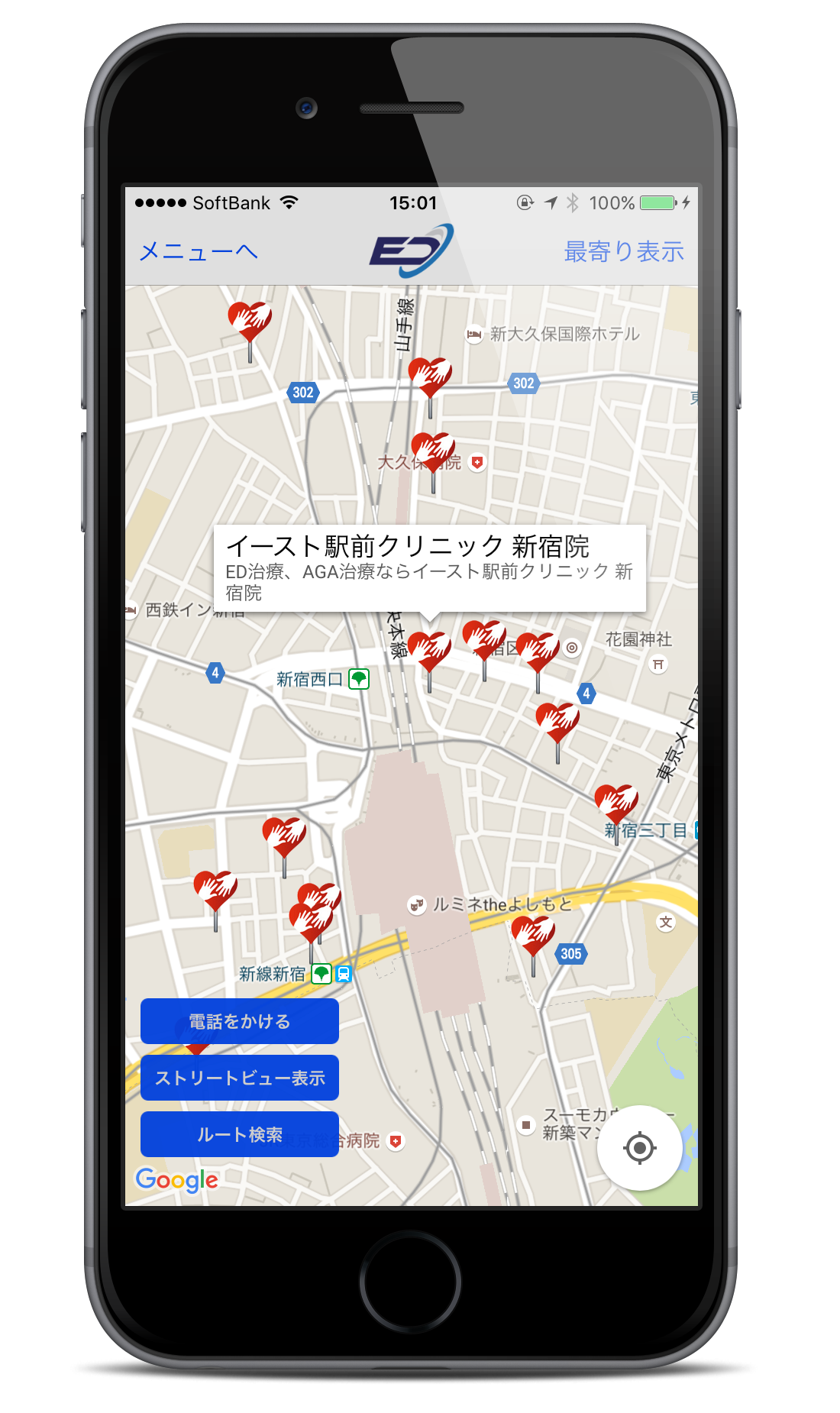 選択したクリニックまでの道順をスマートフォンでナビ